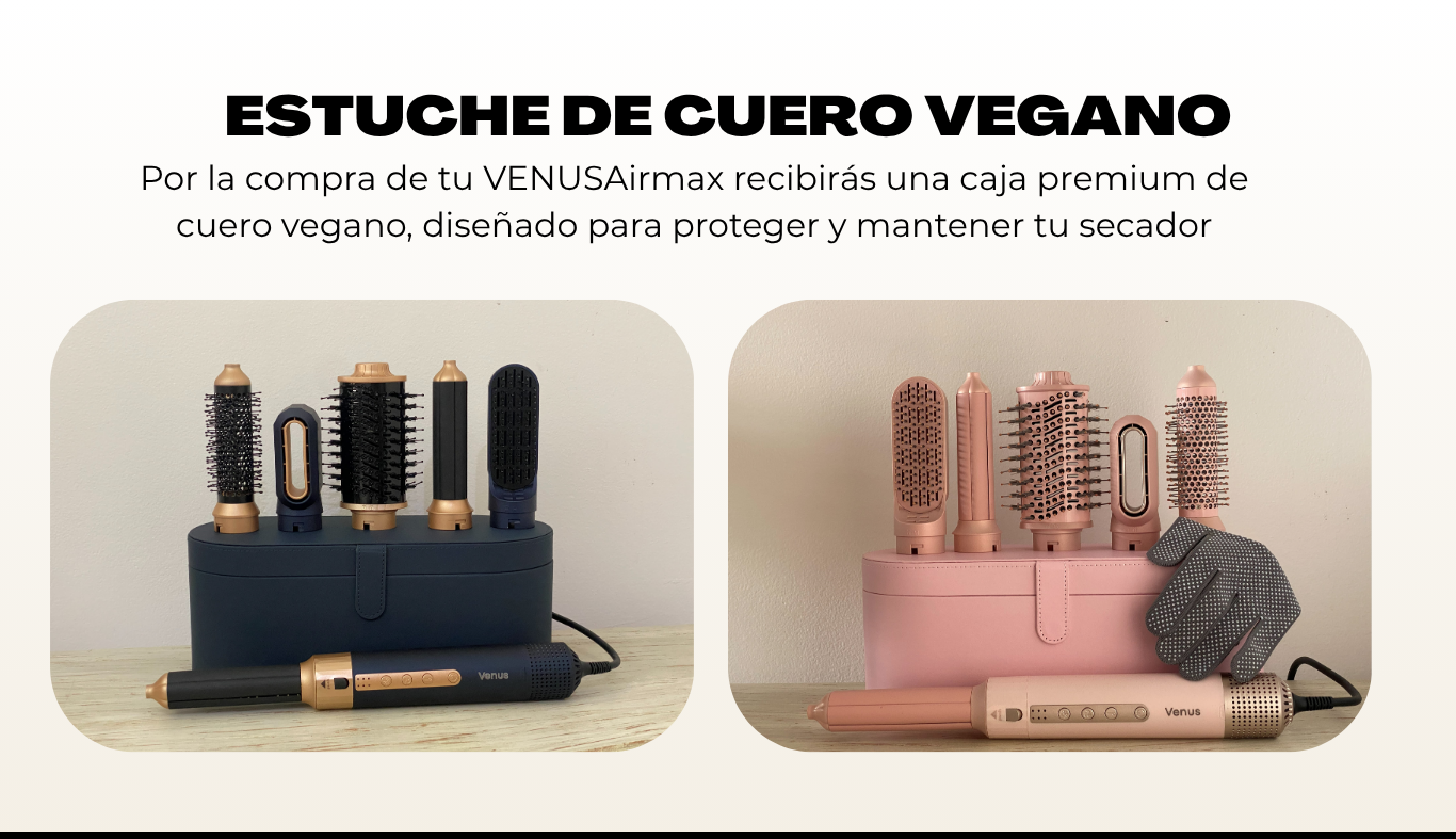 Al comprar recibirás tu VenusAirmax con su estuche de cuero vegano y sus 6 cabezales intercambiables:1x Secador AntiFrizz, 2x Ondulador Smooth y Max,1x Alisador,1x Voluminizador. 1x Accesorio Brushing