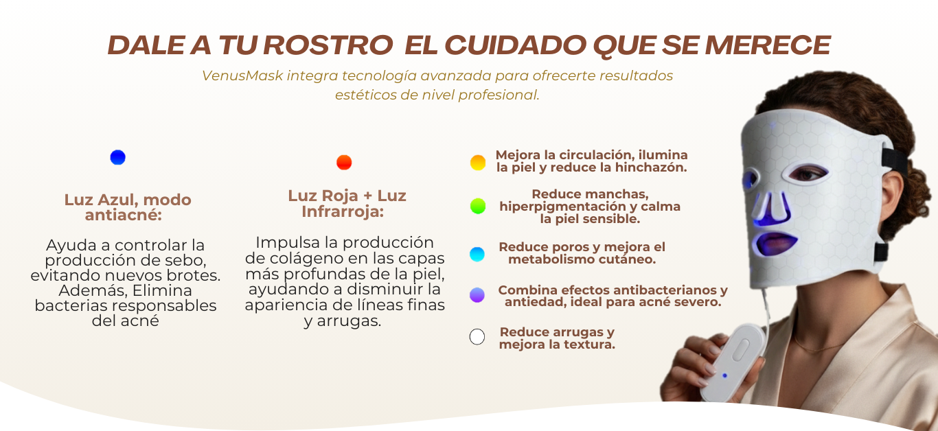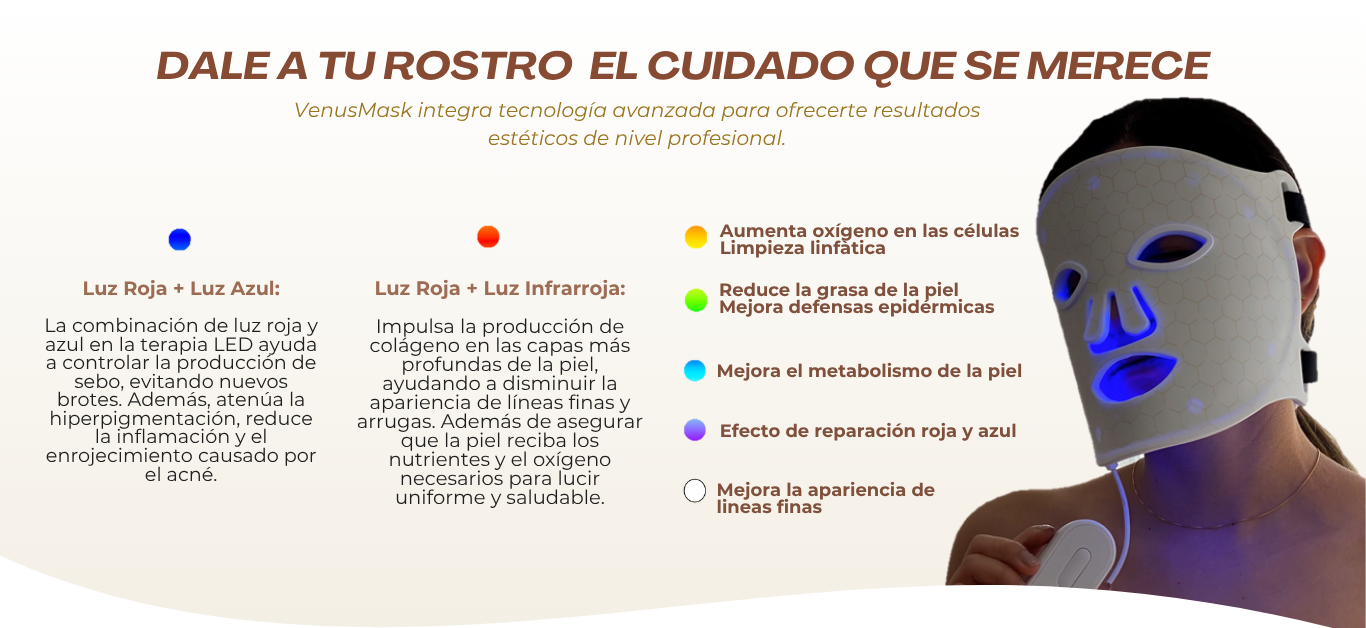 La VenusMask emplea tecnología avanzada de luz LED para abordar y prevenir los problemas más frecuentes de la piel, ayudándote a lograr una apariencia más luminosa y lucir esa piel radiante que tanto deseamos.